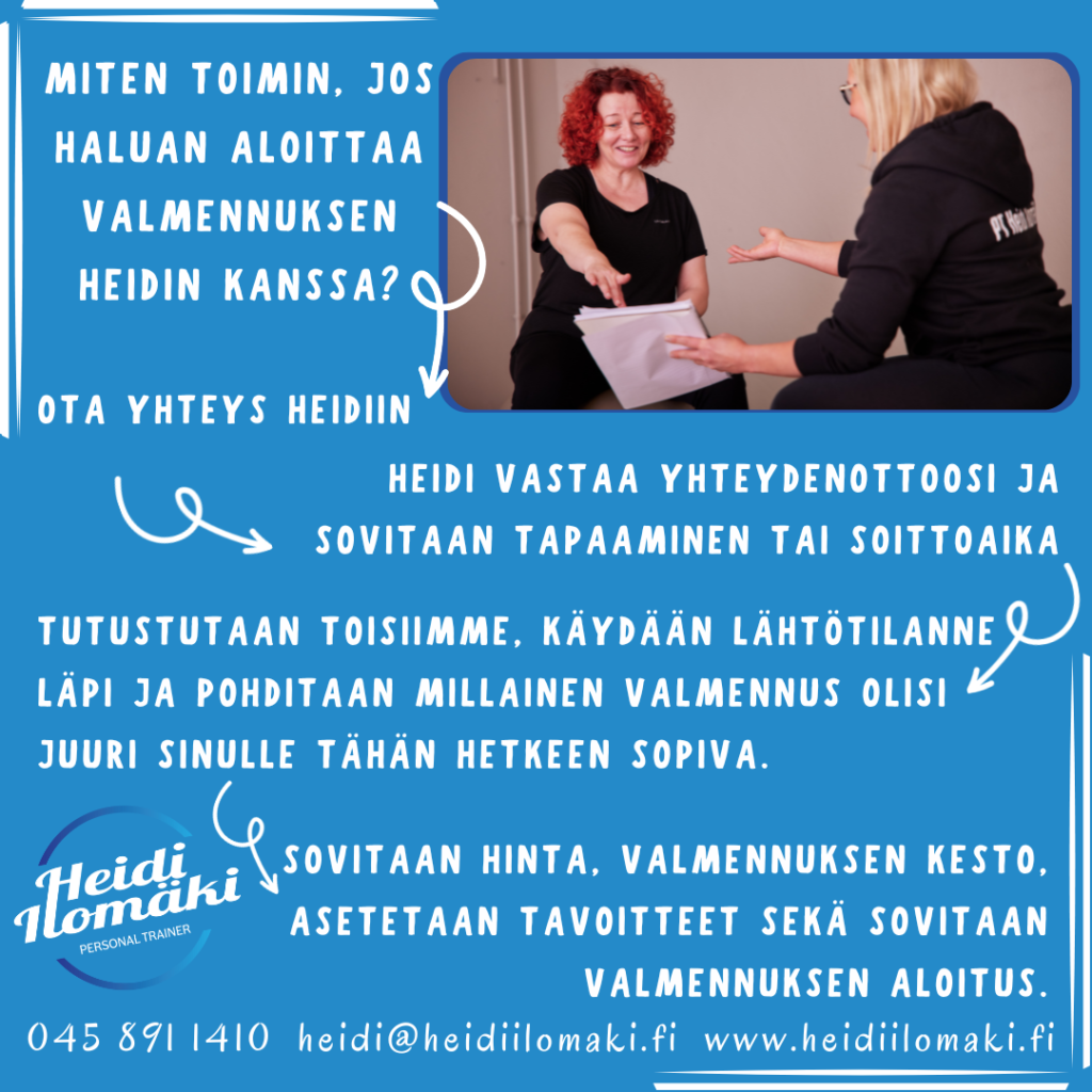 Miten toimin, kun haluan aloittaa valmennuksen Heidin kanssa? Julkaistu 27 heinäkuun, 2023 🙋 Oletko miettinyt, että miten valmennuksen voi aloittaa? 🤔 ➡ Helpoin tapa on ottaa ensin Heidiin yhteyttä📞 045 891 1410 soitto/tekstari/whatsapp📧 heidi@heidiilomaki.fi🌍 www.heidiilomaki.fi 👉 Sen jälkeen muutama käytännön juttu ja sen jälkeen hyvällä fiiliksellä kohti päämäärää!